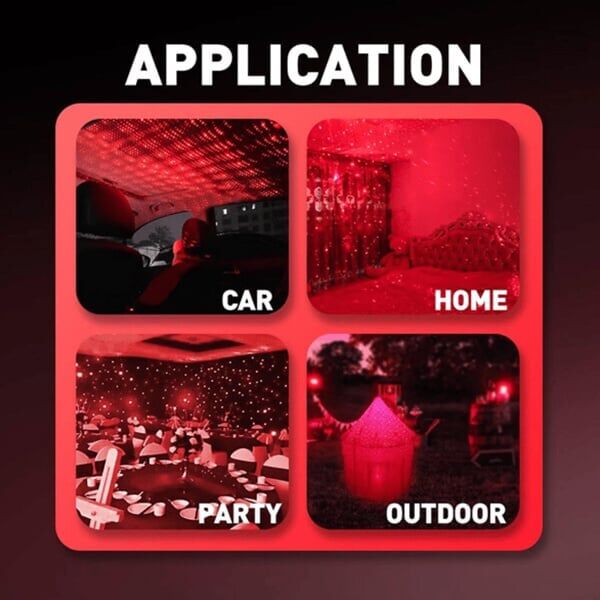 - Dekoracija: Atmosferiniai žibintai ant stogo visos žvaigždės projekcinė lemputė ant automobilio stogo. Jis gali projektuoti itin šviesų ir vėsų žvaigždėtą dangų ant automobilio ir miegamojo stogo. „Sky“ romantišką USB lemputę galima naudoti DJ lempose. vidaus apdaila, dekoratyvinė šviesa, automobilių apdaila.