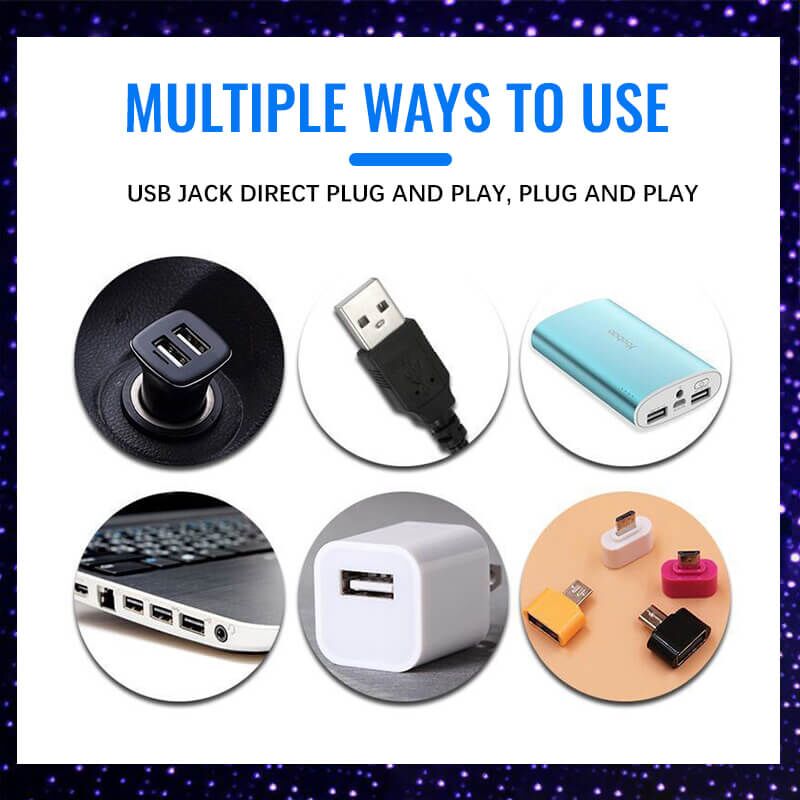 - Paprasta naudoti: nereikia diegti LED atmosferos šviestuvo jokioje USB sąsajoje, jį galima naudoti patalpų dekoravimui, automobiliui, USB kompiuterio naktinei šviesai, Power Bank, sieniniam įkrovimui su USB sąsaja.